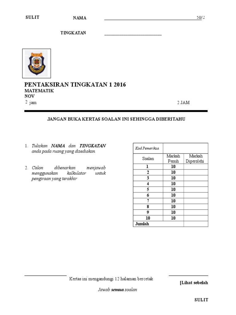SULIT 11031 11031 Bahasa Melayu Kertas 1 OgosSeptember 2016 24 jam J MAKTAB RENDAH SAINS MARA PEPERIKSAAN AKHIR SIJIL. Kertas Soalan Peperiksaan Akhir Tahun Sains Tingkatan 1 adalah antara bahan-bahan terbaik yang kami ada. Kertas Soalan Peperiksaan Akhir Tahun Sains Tingkatan 1.